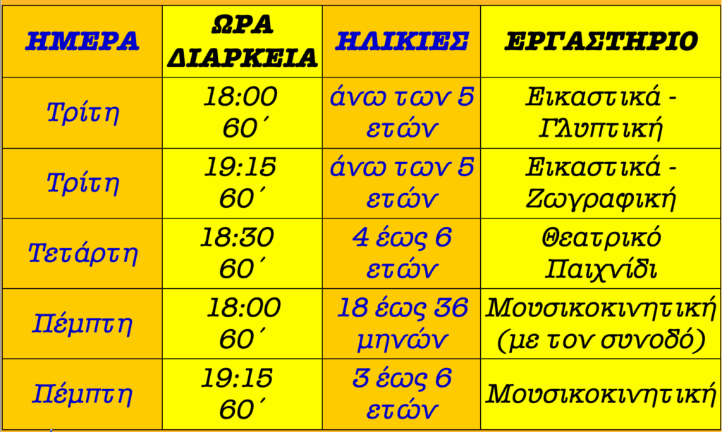 Τα εργαστήρια στοχεύουν στην ολόπλευρη ανάπτυξη των ικανοτήτων και δεξιοτήτων του παιδιού.